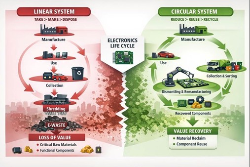 Electronics sit at the core of our modern systems, yet the way they are treated at the end of life remains rudimentary. In the EU, billions of tons of waste are generated every year, and the combination of labor intensity and wide variations in product condition puts real pressure on circular economy ambitions [1]. The challenge is straightforward: these components are high in value and technically sophisticated, accounting for up to 35% of a vehicle’s total cost, while at the same time being physically small and highly complex [2]. They are typically designed for seamless integration, durability, and low assembly cost—choices that make disassembly difficult. Unlike a flat tire, it is rarely possible to see whether a microscopic circuit has failed, and the industry still lacks structured frameworks to address this complexity in a consistent and precise way [3]. As manual inspection rarely delivers a clear financial return, millions of high-value automotive electronic components are shredded each year. The result is a linear system that limits value retention and leads to the loss of critical raw materials [4].